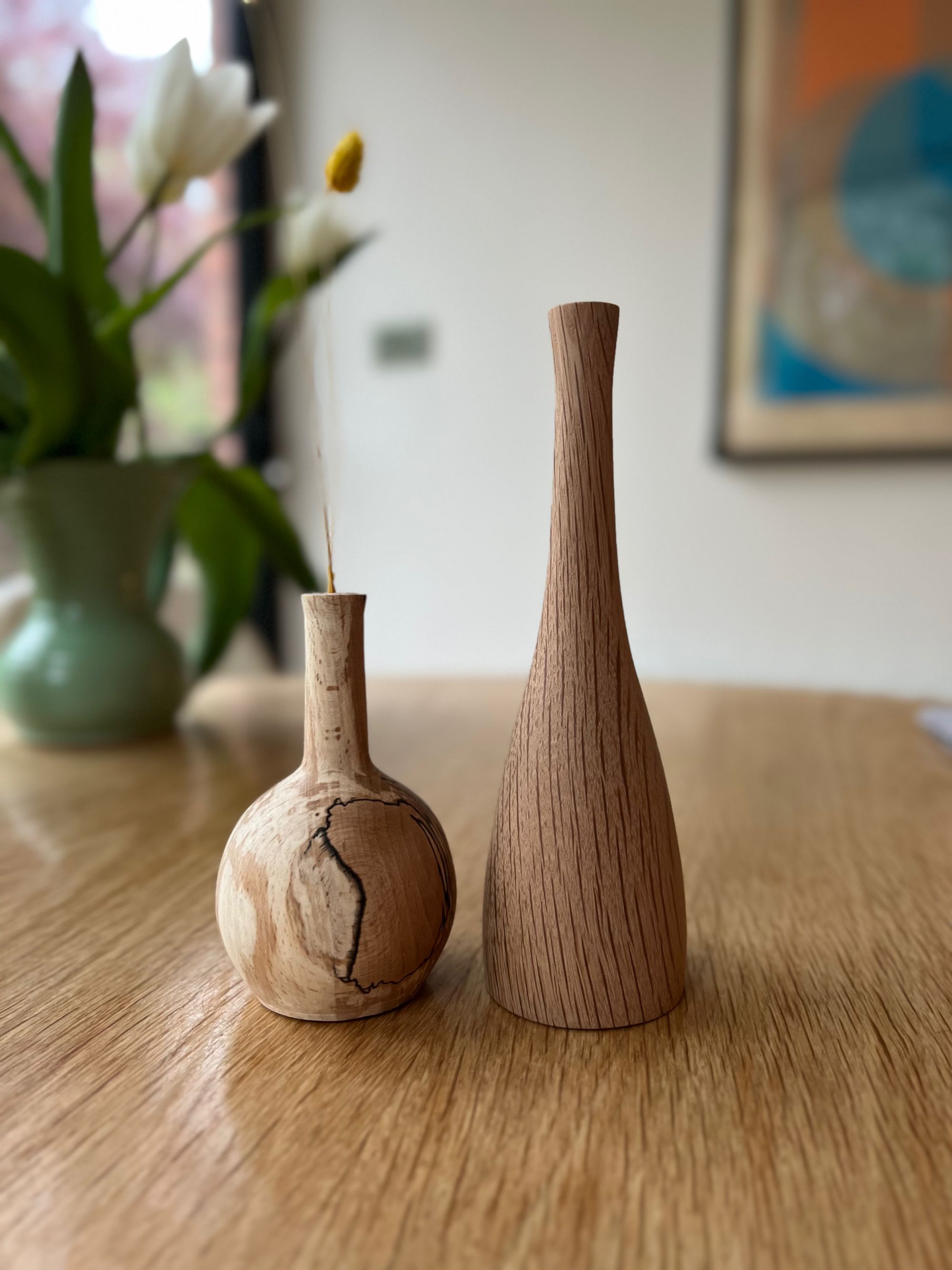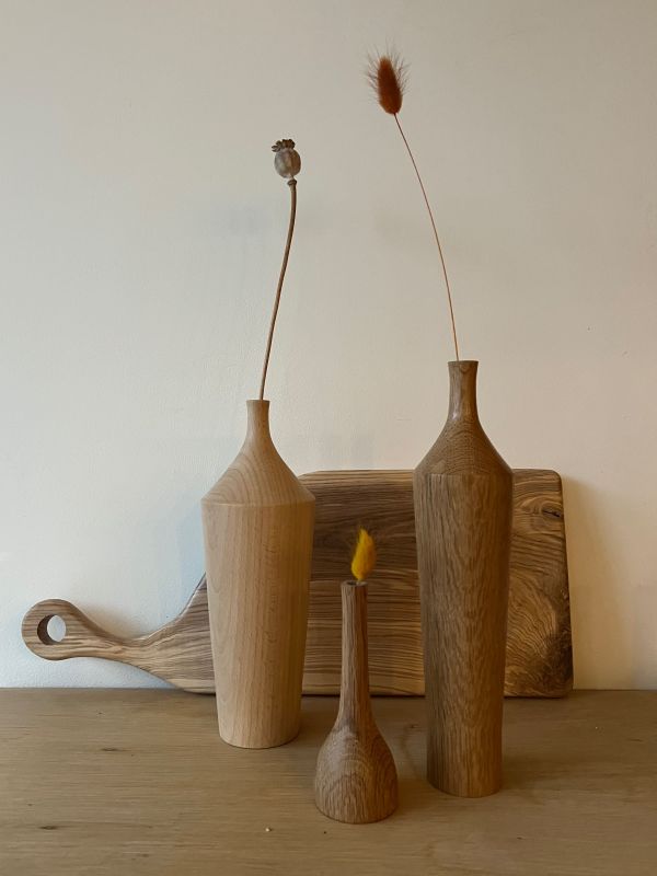 A selection of small vases for dried grasses, some from standard timber, some upcycled from old furniture such as an old oak table leg my dad had kept in a corner of his shed for 40+ years!